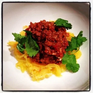 Then, simply scoop out some spaghetti squash onto a plate and top with meat sauce. I like to sprinkle some red pepper flakes and chop up a little bit of cilantro to give the dish a little extra punch.
